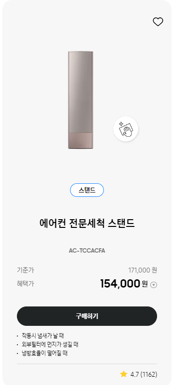 특징: 큰 면적을 커버할 수 있는 스탠드 에어컨 청소 서비스입니다. 면적에 따라 가격이 달라지며, 전문가의 방문을 통해 청소가 이루어집니다.