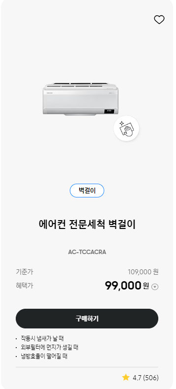 특징: 일반적인 가정에서 많이 사용하는 벽걸이 에어컨에 대한 청소 서비스입니다. 전문가가 방문하여 청소를 진행하며, 에어컨의 성능을 유지하고 실내 공기 질을 개선하는 데 도움을 줍니다.